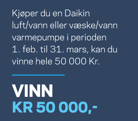 Kjøper du en luft/vann eller væske/vann varmepumpe fra Daikin mellom 1. februar og 31. mars. kan du vinne hele 50 000 kr. Vi trekker ut en heldig vinner 1. april. Alt du trenger å gjøre for å være med i konkurransen er å fylle ut konkurranseskjemaet nedenfor. Lykke til!